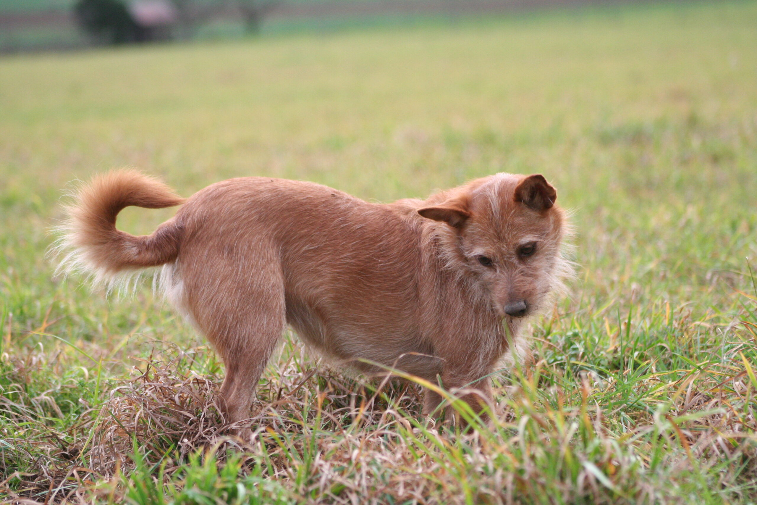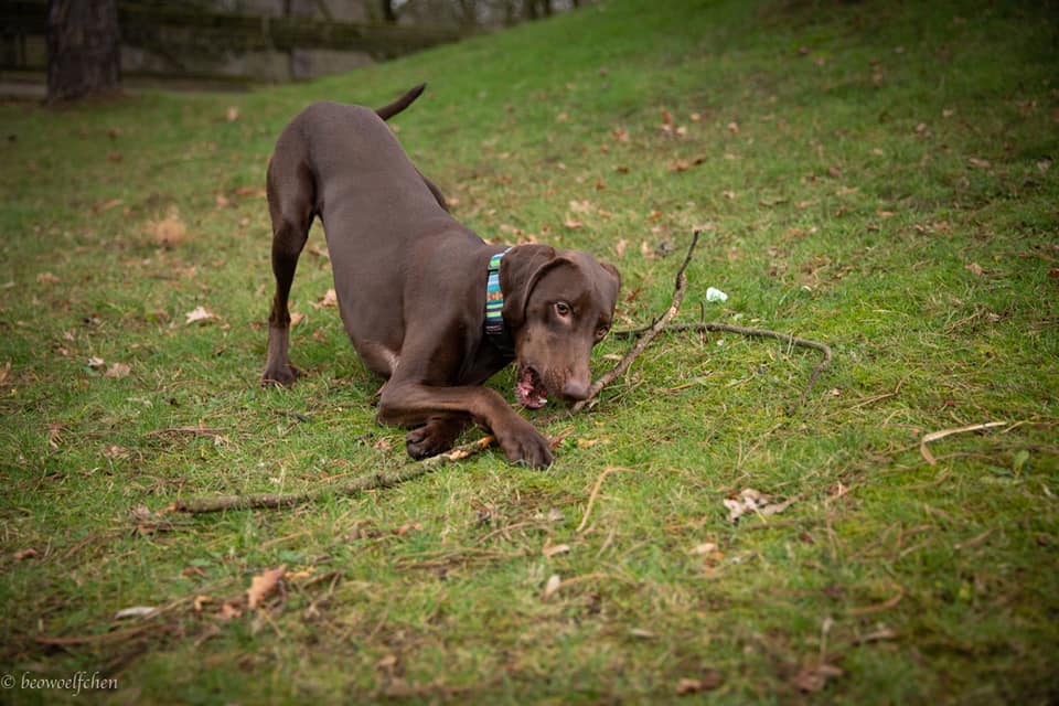 Er reagiert aktuell noch sehr stark auf unkastrierte, große Rüden und möchte sie angreifen und verscheuchen.